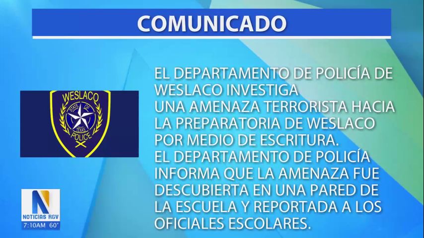 La policía de Weslaco ha dicho que están conscientes de la amenaza y están trabajando para saber quién es el responsable.