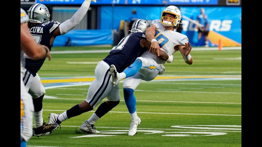 Parsons' first career sack came on a generous call by officials who ruled quarterback Justin Herbert was in his grasp when he threw a pass while backpedaling. Regardless, the 18-yard sack ultimately forced the Chargers to settle for a tying field goal.