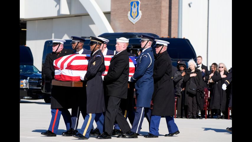In Georgia, eight military pallbearers held Carter's casket as canons fired on the tarmac nearby. They carried it to a vehicle that lifted it to the passenger compartment of the aircraft, the iconic blue and white Boeing 747 variant that is known as Air Force One when the sitting president is on board. Carter never traveled as president on the jet, which first flew as Air Force One in 1990 with President George H.W. Bush on board.