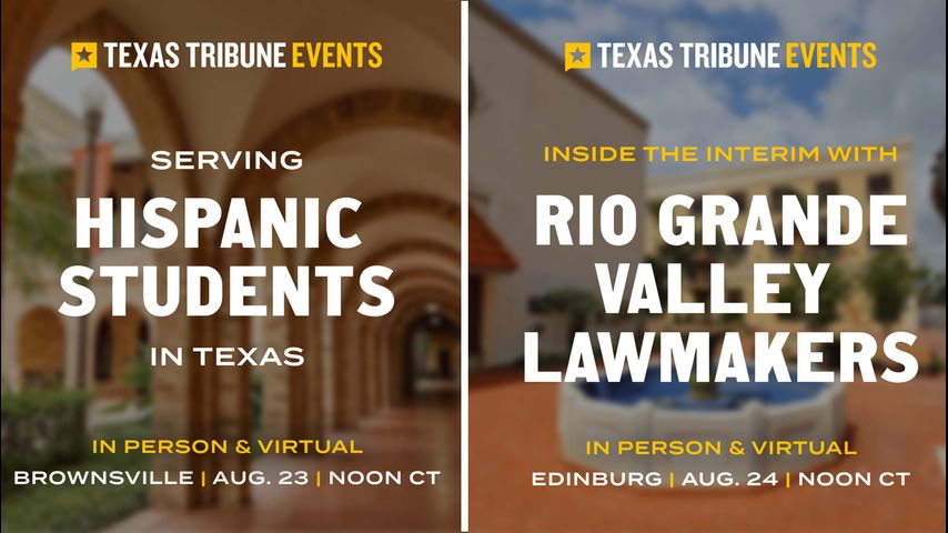 Join The Texas Tribune, the nonprofit statewide news organization, at noon on Tuesday, Aug. 23, in Brownsville or tune in online for “Serving Hispanic Students in Texas,” a free, local event exploring what needs to happen to support Hispanic-serving institutions in our state, how they’ve adapted during the pandemic and what they’re doing to help students graduate.