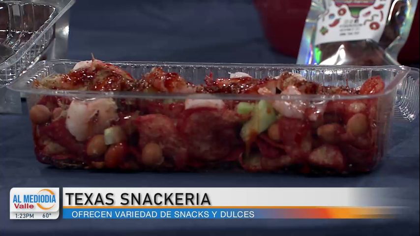En La Entrevista, Adrián Martínez y Ashley Garza, los dos dueños de Texas Snackeria ubicada en Donna demuestran los diferentes snacks y dulces que venden en su tienda.