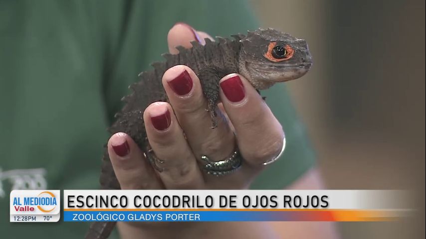 Alejandra Rodríguez, coordinadora de marketing de Gladys Porter Zoo, visita Noticias RGV para presentar al escinco cocodrilo de ojos rojos.