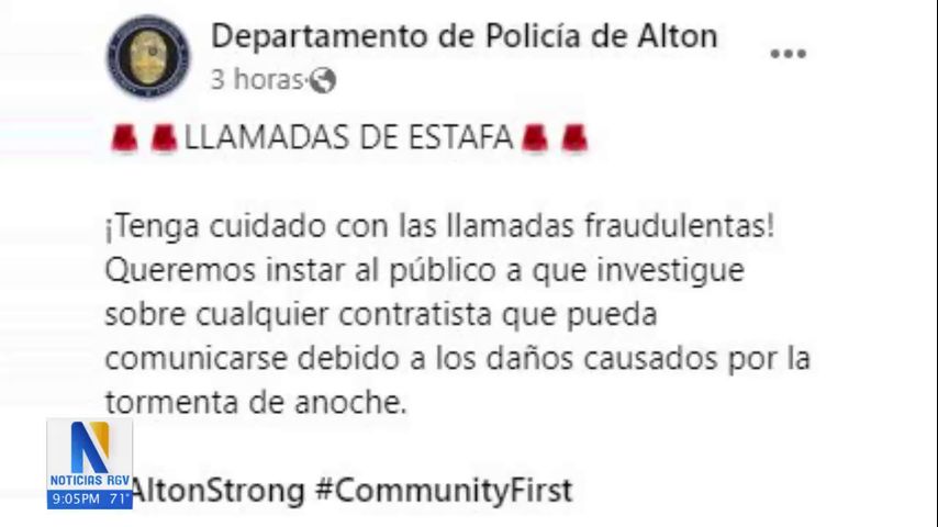 El Departamento de Policía de Alton quiere advertirle sobre llamadas que se han registrado este fin de semana, asegúrese de hacer su investigación si alguien que dice ser un contratista le llama para ayudar con los daños de la tormenta.