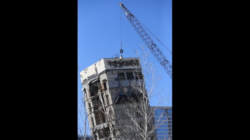 DALLAS (AP) - The “Leaning Tower of Dallas,” a social media sensation born when a part of a building survived implosion, endured hundreds of blows from a wrecking ball Monday.
