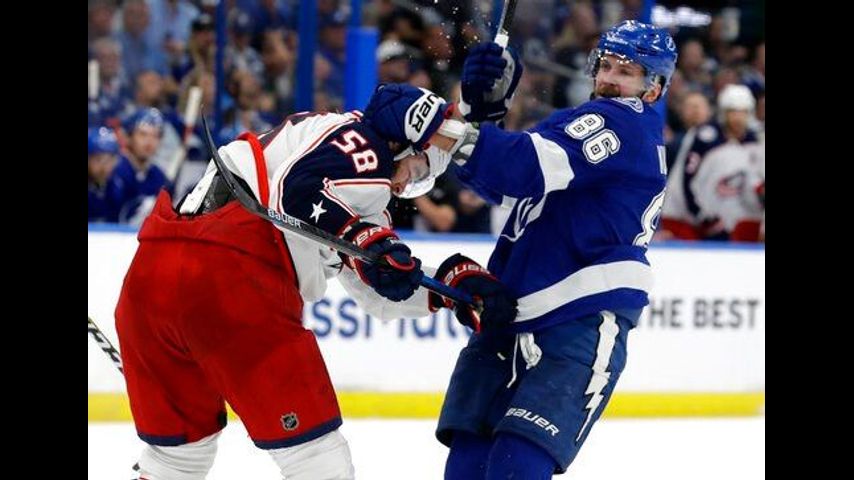 The Presidents' Trophy winning Lightning will have to try to win in Columbus on Sunday without the player who put up a league-best 128 points during the season. They also could be without banged-up Norris Trophy caliber defenseman Victor Hedman, who did not practice Saturday.