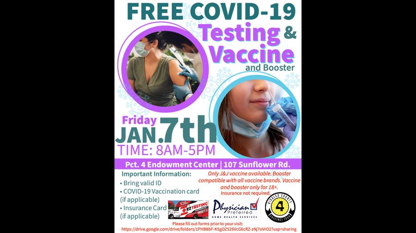 On Friday, Jan. 7, Hidalgo County Precinct 4 will hold a free COVID-19 testing and vaccine site from 8 a.m. through 5 p.m. PCT4 Endowment Center located at 107 Sunflower Road in Edinburg.