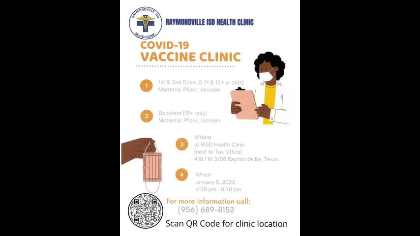 The Raymondville ISD Health Clinic will be holding a vaccine clinic on Wednesday, January 5. The clinic will be held at 419 FM 3168 from 4:30 p.m. through 6:30 p.m. For more information, call 956-689-8152.
