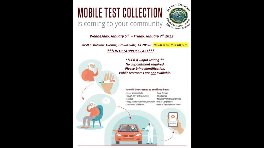 - • A mobile COVID-19 test collection site will be open from Wednesday, Jan. 5 through Friday. Jan. 7.