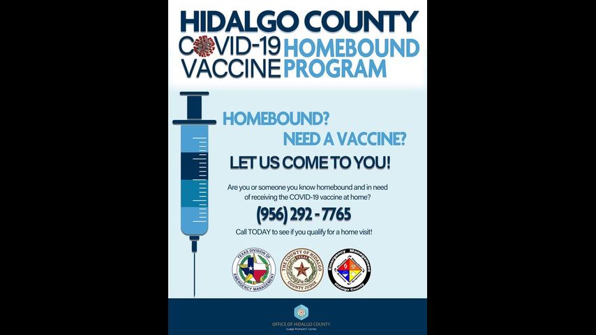 The county is making COVID-19 vaccines available for homebound residents as part of the Hidalgo County COVID-19 Homebound Vaccine Program. Those who are home bound and in need of a vaccine are urged to call 956-292-7765 to see if they qualify for a home visit.
