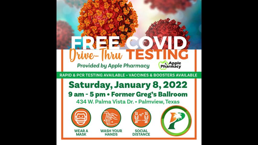 Free COVID-19 testing will be offered at a drive-thru site in Palmview on Saturday, Jan. 8 from 9 a.m. to 5 p.m. at 34 W. Palma Vista Dr.
