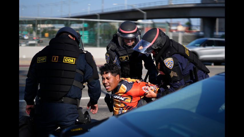 The protests began Friday after federal immigration raids arrested dozens of workers in Los Angeles. Protesters blocked a major freeway and set cars on fire over the weekend, and police responded with tear gas, rubber bullets and flash-bang grenades.