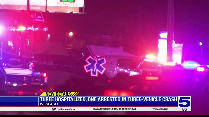 A man was arrested and three people were hospitalized after a three-vehicle crash in Weslaco Thursday night, according to police.