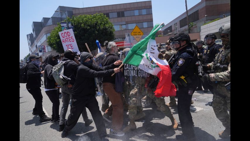 National Guard troops stood shoulder to shoulder Sunday morning in LA, carrying long guns and riot shields as protesters shouted "shame" and "go home." After some demonstrators closely approached the Guard members, another set of uniformed officers advanced on the group, shooting smoke-filled canisters into the street.