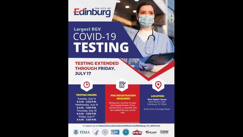 According to an Edinburg news release, the COVID-19 testing site at the Bert Ogden Arena was extended through July 17.