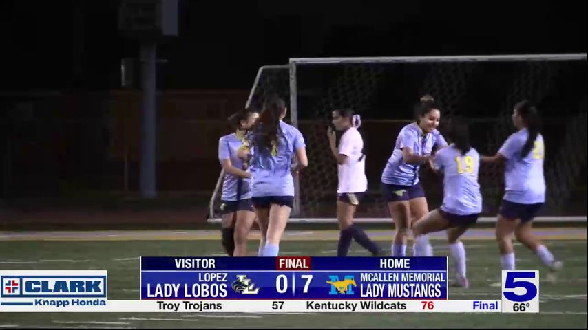 Highlights from the McAllen Memorial Lady Mustangs 7-0 win over Brownsville Lopez in the bi-district round of the 2025 high school soccer playoffs.