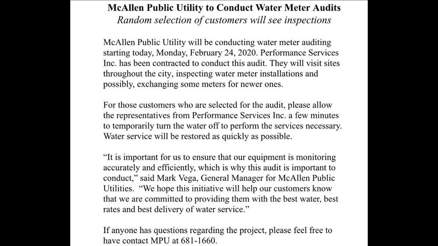 According to the release, Performance Services Inc. will visit sites throughout McAllen to inspect water meters and exchange some for newer ones.