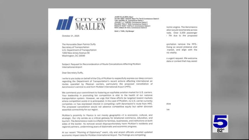 The city of McAllen sent a letter Friday to Washington about the cancelled flight route between McAllen and Mexico City.