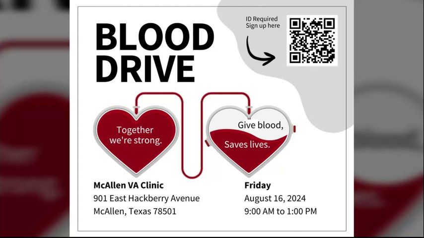 The blood drive is happening on Friday at the McAllen VA Clinic from 9 a.m. to 1 p. Donors must present an ID.