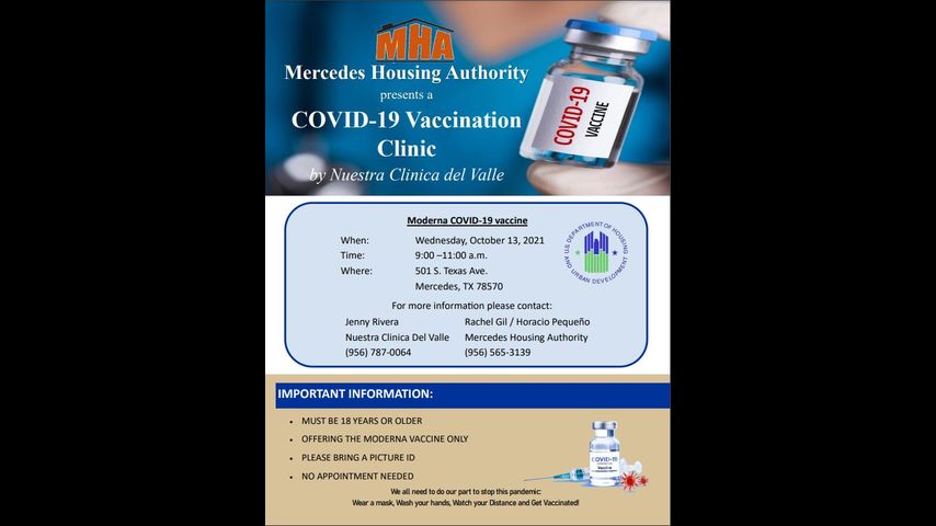 The Mercedes Housing Authority is hosting a COVID-19 Vaccination Clinic with the help of Nuestra Clinica del Valle of Mercedes and U.S. Department of Housing and Urban Development.