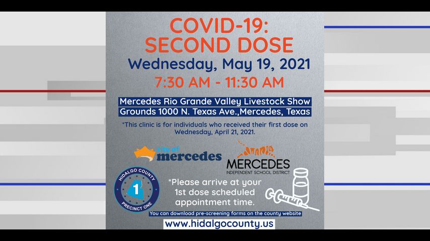 The city of Mercedes will host a second dose COVID-19 vaccine clinic from 7:30 a.m. to 11:30 a.m on Wed., May 19, at the Rio Grande Valley Livestock Show Ground, located at 1000 North Texas Avenue.