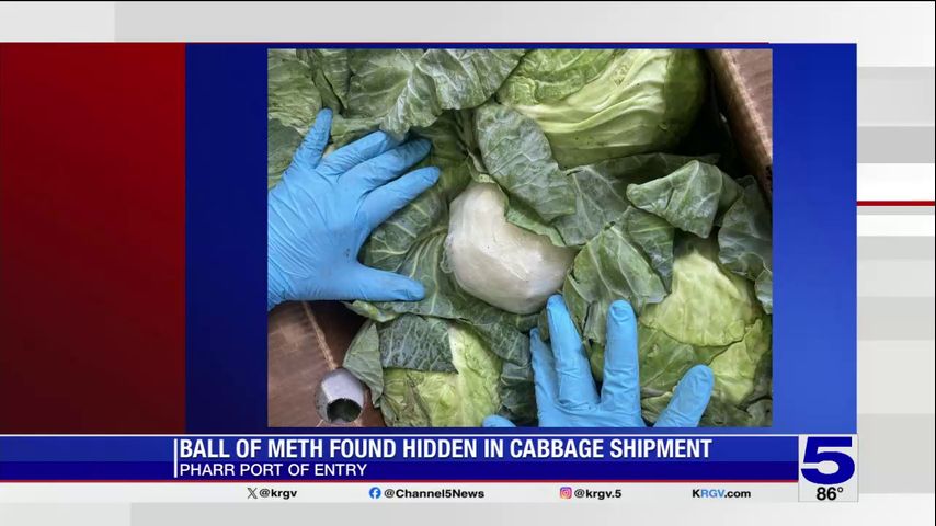 The news release said a search of the vehicle revealed 1,154 packages containing a crystal-like substance concealed within cabbages in the cargo area. The substance was determined to be methamphetamine with a total weight of 1,356 kilograms. The estimated street value was more than $2.8 million.