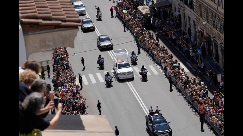 According to Vatican estimates, some 250,000 people flocked to the funeral Mass at the Vatican and 150,000 more lined the motorcade route through downtown Rome to witness the first funeral procession for a pope in a century. They clapped and cheered "Papa Francesco" as his simple wooden coffin traveled aboard a modified popemobile to St. Mary Major Basilica, some 6 kilometers (3.5-miles) away.