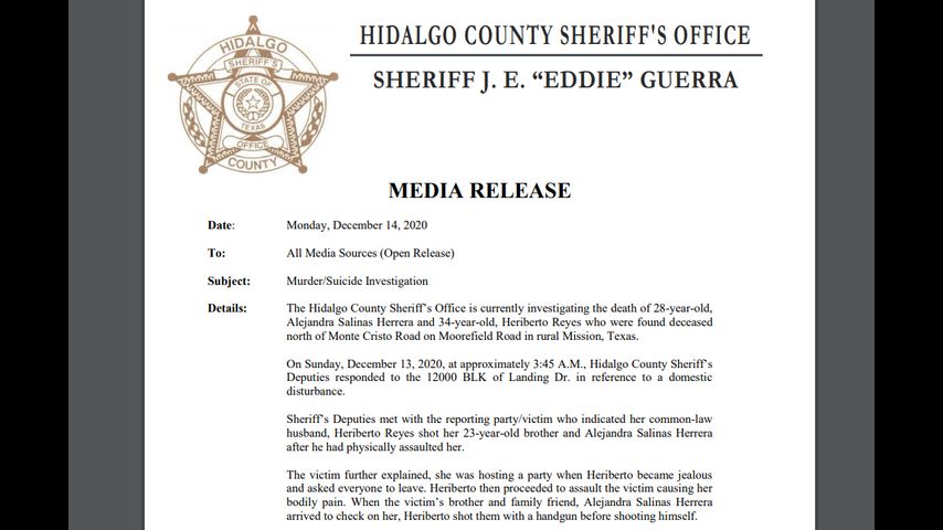 According to a news release from Hidalgo County, "Sheriff's Deputies met with the reporting party victim who indicated her common law husband, Heriberto Reyes shot her 23-year-old brother and Alejandra Salinas Herrera after he physically assaulted her."
