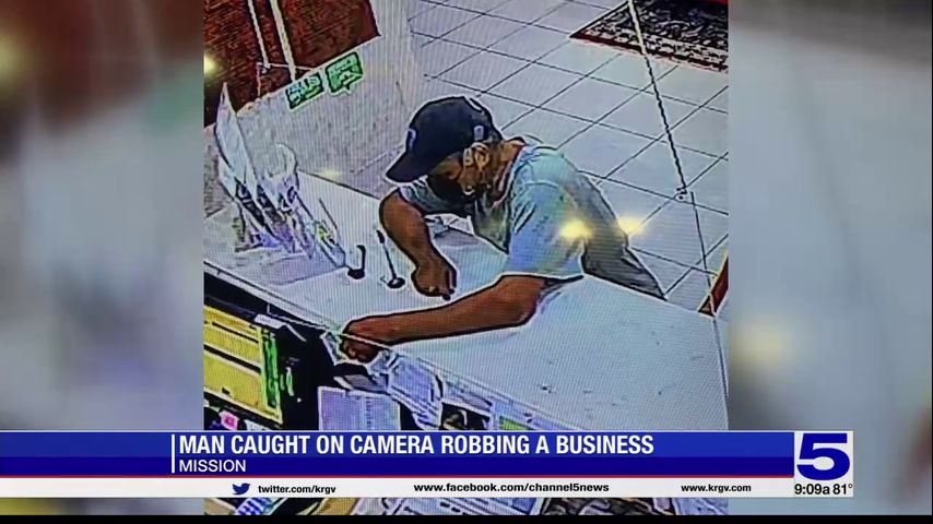 The Mission Police Department is searching for a man caught robbing a business on camera.