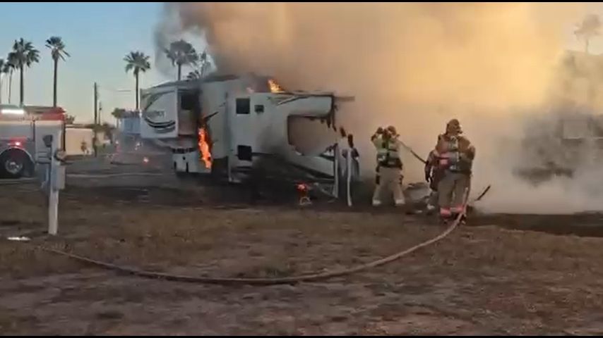 Alamo Fire Chief R.C. Flores said when crews arrived, a 5th-wheel RV was fully engulfed in flames. The RV was a primary residence for two adults, who managed to exit the mobile home safely.