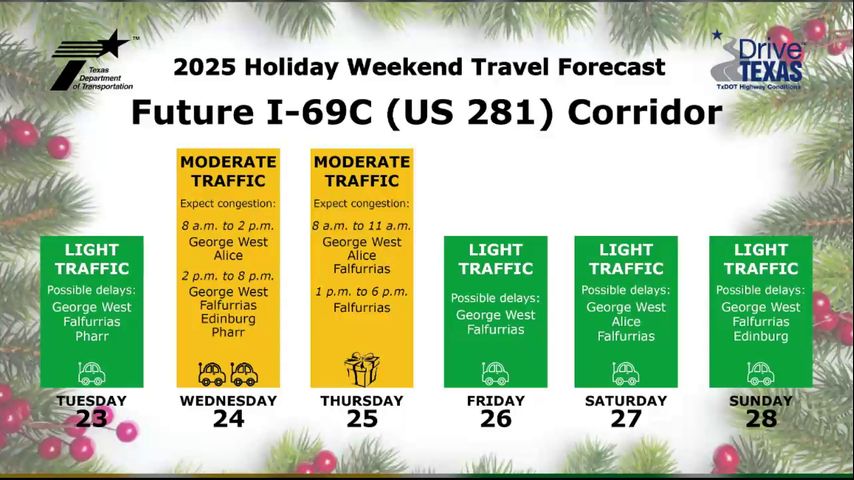 The TxDOT forecast also says Christmas Eve and Christmas Day are expected to be the highest travel days for those who plan to head out of the Valley through US 281.