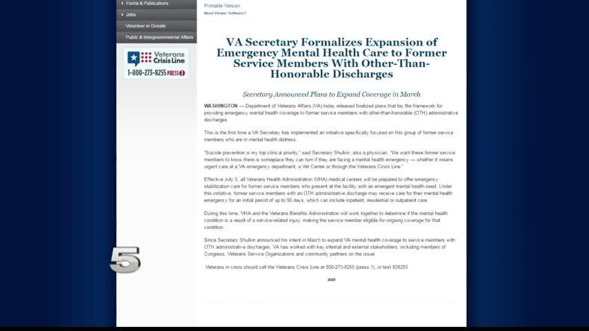 Under the new policy, OTH veterans may get help in an emergency up to 90 days. VA medical staff will also determine if the veteran's mental crisis is a result of what they call a “service-related injury.” If eligible, they could get more medical attention.