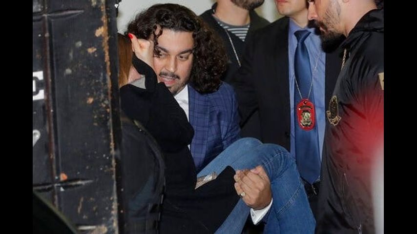 After the testimony, Najila Trindade was carried out of the police station in the arms of her lawyer with a black jacket covering her head. It was unclear why she was physically carried.