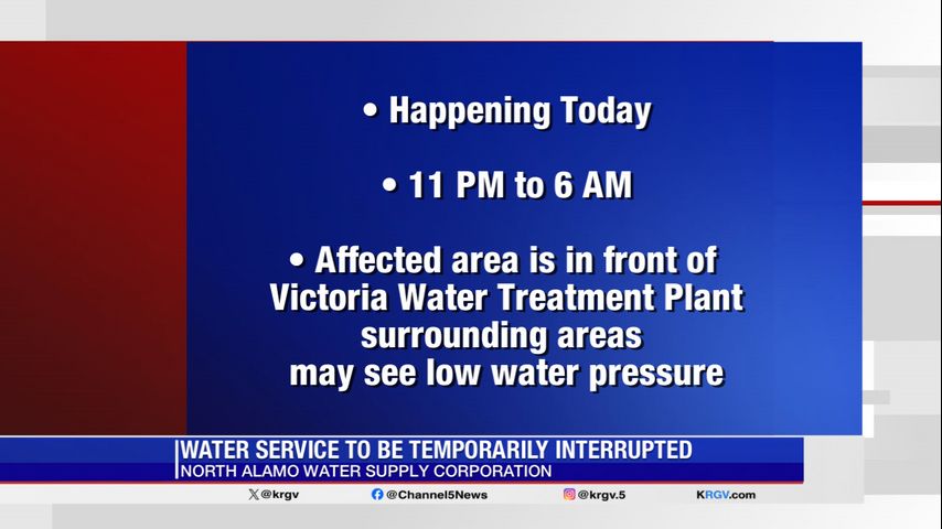 The service interruption is being caused by construction upgrades to the Victoria Water Treatment Plant, located at 6031 N. Victoria Rd. in Donna, the release stated.