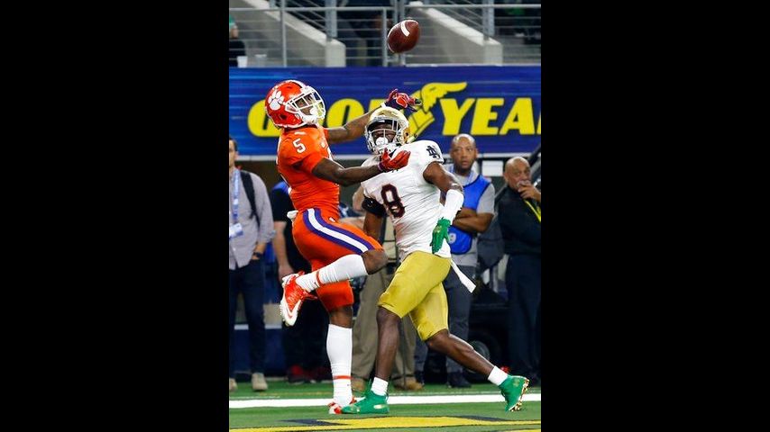 ARLINGTON, Texas (AP) - Notre Dame missed out on a big early game-turning play by the very nose of the football. The Fighting Irish defense missed having All-America cornerback Julian Love on the field when Clemson took over the Cotton Bowl.