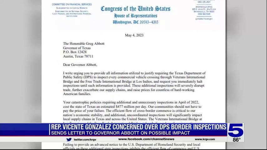 Congressman Vicente Gonzalez (D-34) said he sent a letter to Gov. Greg Abbott regarding the locations of the inspections that are being done at the Veterans International Bridge at Los Tomates and the Free Trade International Bridge at Los Indios.