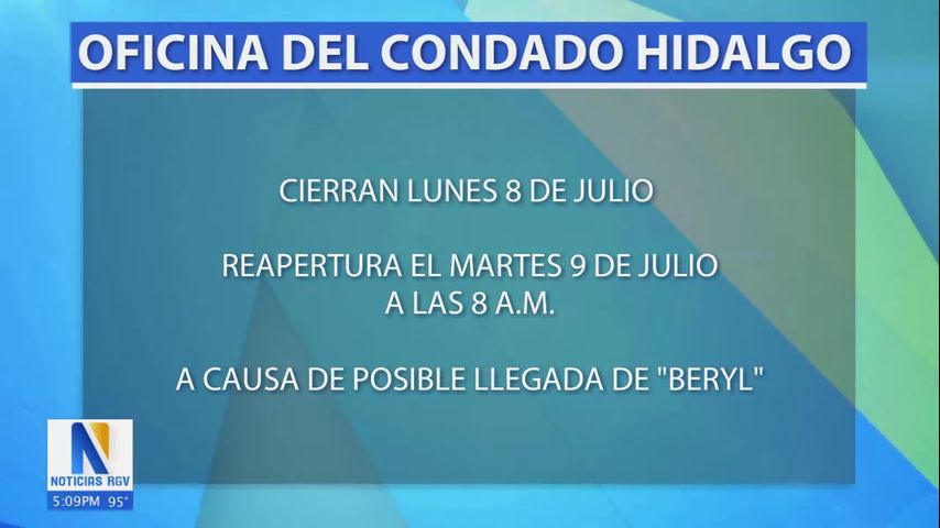 A causa de la posible llegada de Beryl, la oficina del condado Hidalgo anunció que todas sus oficinas cerrarán el próximo lunes 8 de julio.