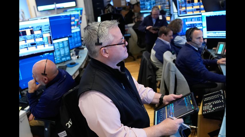 People work on the floor at the New York Stock Exchange in New York, Monday, April 13, 2026. (AP Photo/Seth Wenig)