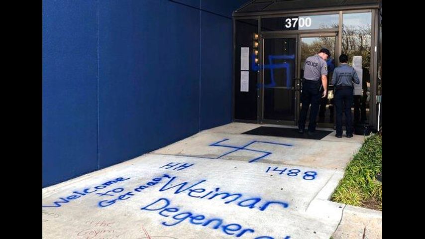 Racist and anti-Semitic graffiti as well as anti-LGBTQ epithets were spray painted on the front door, walkway and other areas outside the state Democratic Party headquarters in Oklahoma City, said former Democratic Gov. David Walters, who owns the building with his wife, Rhonda. Swastikas were also spray-painted onto the doors.
