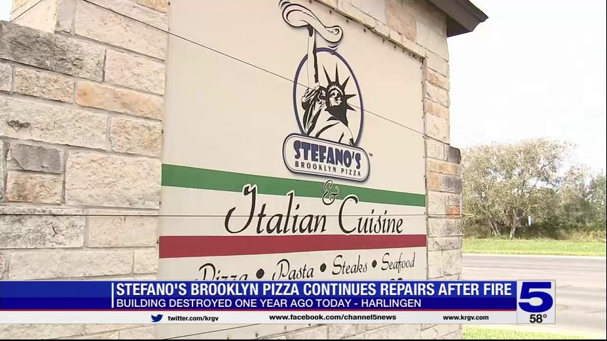 One year after a fire ripped through the building, repairs continue at the Harlingen location of Stefano's Brooklyn Pizza.