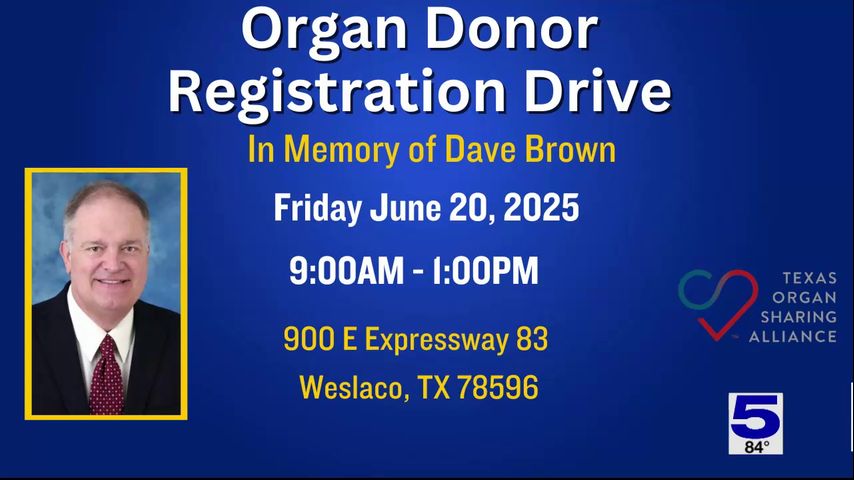 Channel 5 News will be holding an organ donor registration drive on Friday, June 20, at our Weslaco studio at 900 East Expressway 83.