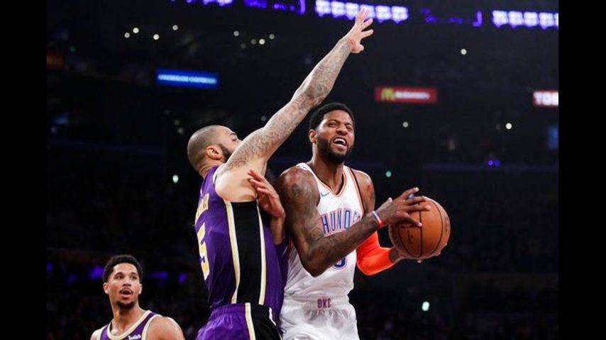 George struggled with his outside shooting, going 2 of 11 from beyond the arc, but otherwise carved up the Lakers' perimeter defense. George and the Thunder appeared to draw motivation from the booing: George got a technical foul for slapping the backboard after slamming an alley-oop from Westbrook, who mimicked Lakers guard Lance Stephenson's air guitar celebration moments later when George drew a foul from Stephenson while hitting a jumper.