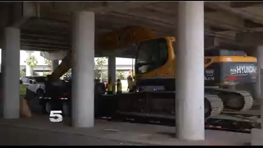 An excavator didn’t make it through the 15-foot clearance. The impact busted the machine’s hydraulic line and chipped the bridge’s underside.