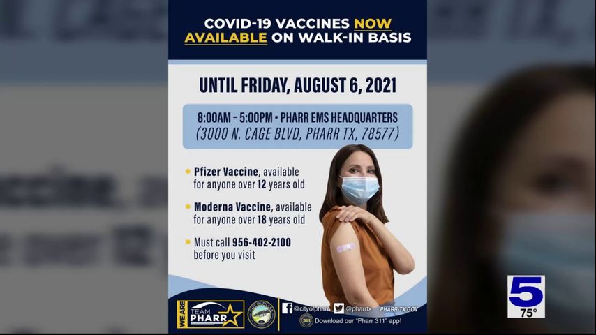 Vaccines will be available to anyone over 12-years-old from 8 a.m. until 5 p.m. at the Pharr EMS Headquarters located at 3,000 North Cage Boulevard.