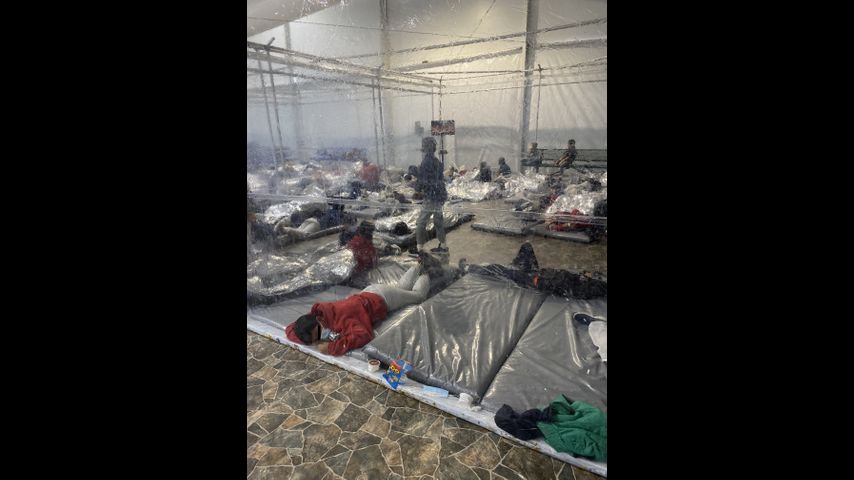 The newly published photos released by Cuellar's office show groups of children crowded together inside the partitions. Some appear to be watching television while others are lying on floor mats, some side by side. Children are shown wearing surgical masks but are close to each other.