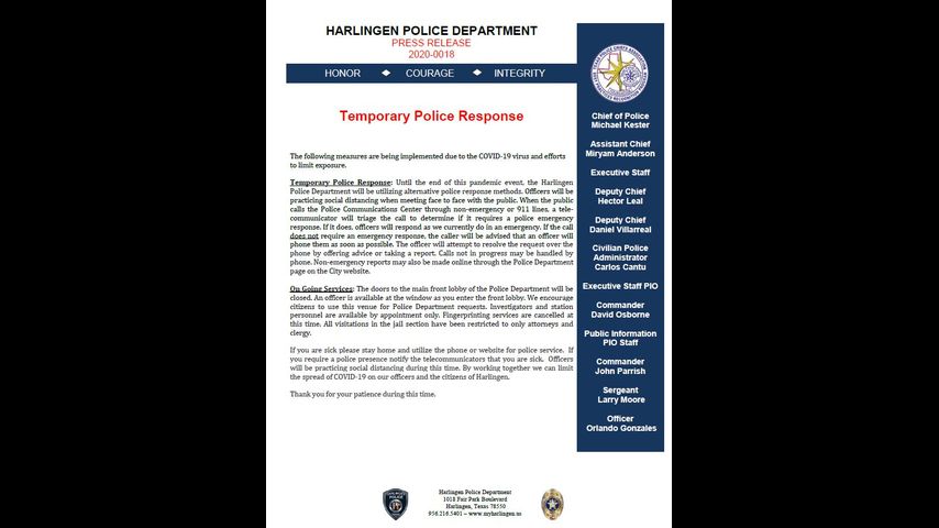 Policía de Harlingen limita contacto en persona por precaución ante coronavirus