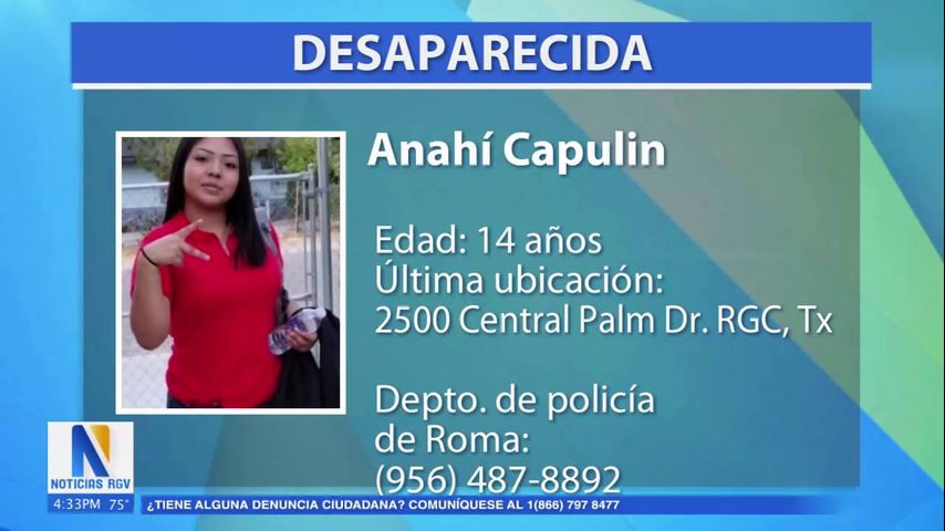 Este jueves 18 de enero la policía de Río Grande City emitió una alerta para encontrar a una joven desaparecida, identificada como Anahí Capulín, de 14 años de edad.