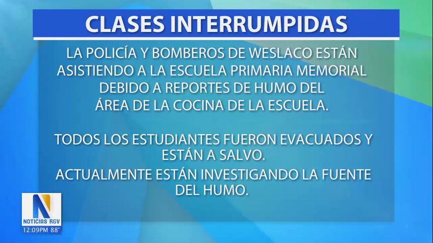 El Departamento de Policía de Weslaco está ayudando al Departamento de Bomberos de Weslaco en la Escuela Primaria Memorial, ubicada en 1700 South Border Avenue, después de recibir informes de humo que salía del área de la cocina de la escuela.