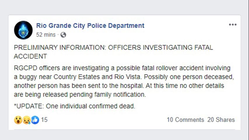 The Rio Grande City Police Department announced Saturday that one person died and another person was hospitalized after an "accident involving a buggy."