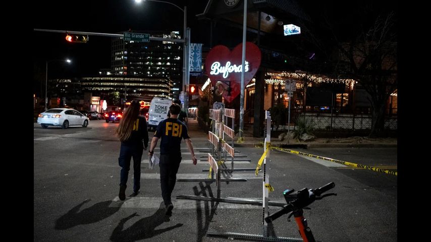 FBI personnel walk toward the scene of a fatal shooting that left three dead, including the suspected shooter, and wounded at least 14 others, in downtown Austin on March 1, 2026. Joel Angel Juarez for The Texas Tribune