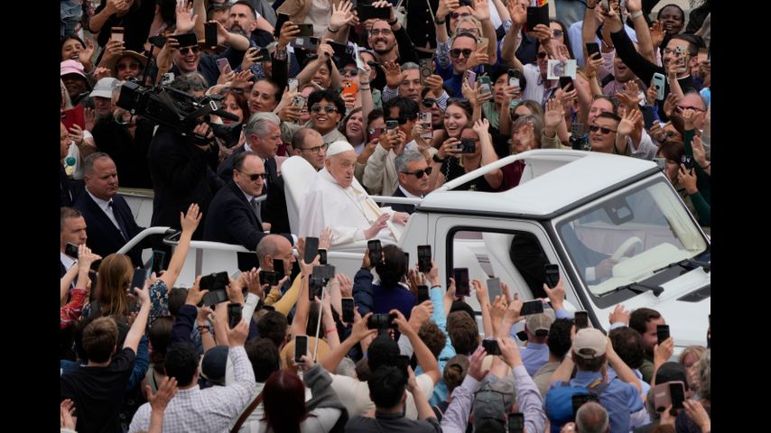 VATICAN CITY (AP) — Pope Francis emerged from his convalescence on Easter Sunday to bless thousands of people in St. Peter's Square and treat them to a surprise popemobile romp through the piazza, drawing wild cheers and applause as he continues his recovery from a near-fatal bout of double pneumonia.